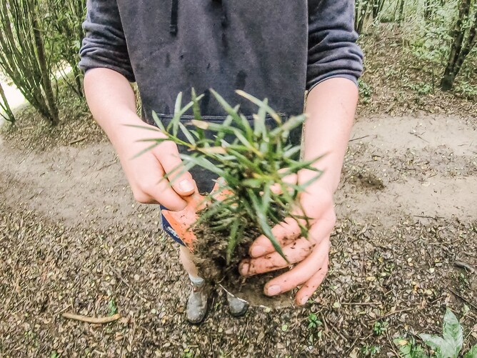 While the seedlings are still young enough and small enough to successfully transplant, we have been gradually rescuing these mini Totaras in order to give them a fighting chance of survival - where they were found they had been growing under dense forest canopy meaning they would most likely have been outgunned for light, nutrients, space and security.