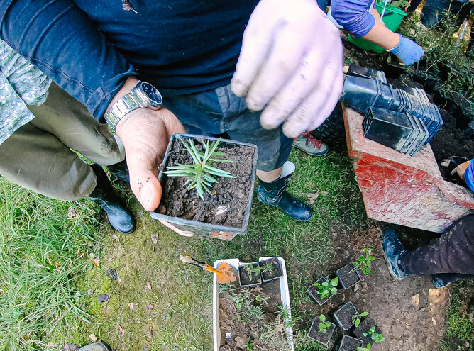 We have been gradually rescuing these mini Totaras in order to give them a fighting chance of survival - where they were found they had been growing under dense forest canopy meaning they would most likely have been outgunned for light, nutrients, space and security.