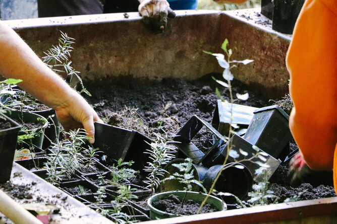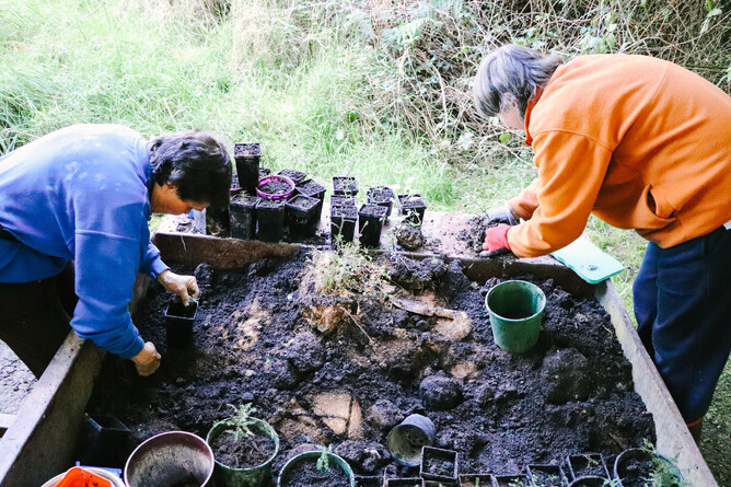While all the seedlings are still young enough and small enough to successfully transplant, our wonderful team of volunteers (in the photo below) potted them individually and moved them to our secure nursery growing area.