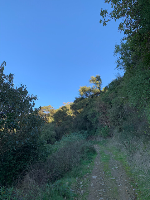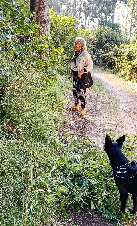 Having shuffled through the mounting pile of colourful deciduous leaves now fallen in the garden, I headed out and up the grassy hill and into the quiet canopied start of the Big Easy Walk Track, being tugged along by 2 very excited dogs on leash. A joy for all of us to be out on such a glorious Autumn Day. It was doggy heaven for them! With their olfactory senses working overtime exploring every trace of smell be it rabbit or wallaby tracks and much more no doubt....they paused a lot! Their detective sniffing pace suited my mood as I slowed to a meditation pace to match theirs and I was taking the time to absorb everything around me using all my olfactory, sight and hearing senses....taking time to stare into the trees, plants and understory.