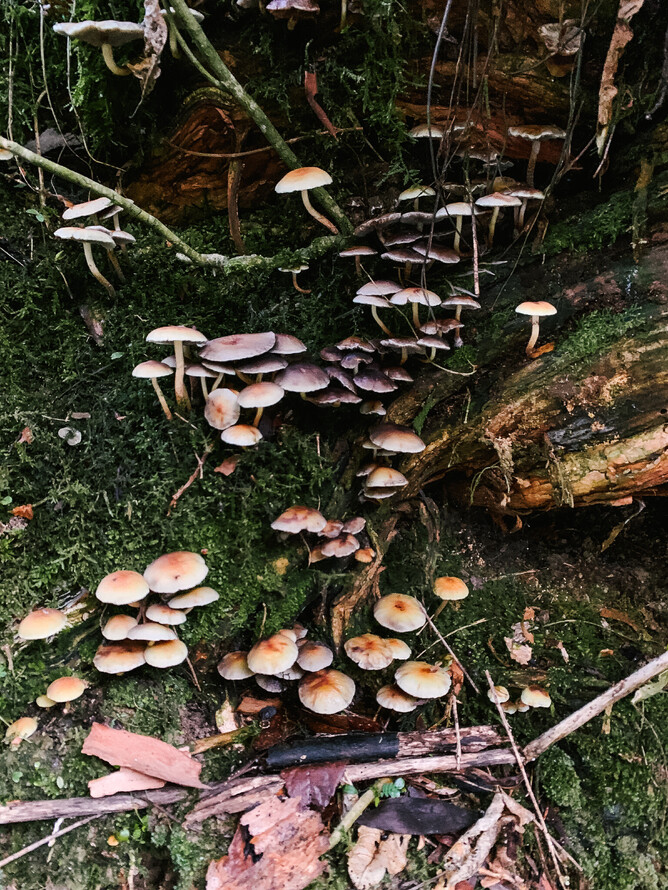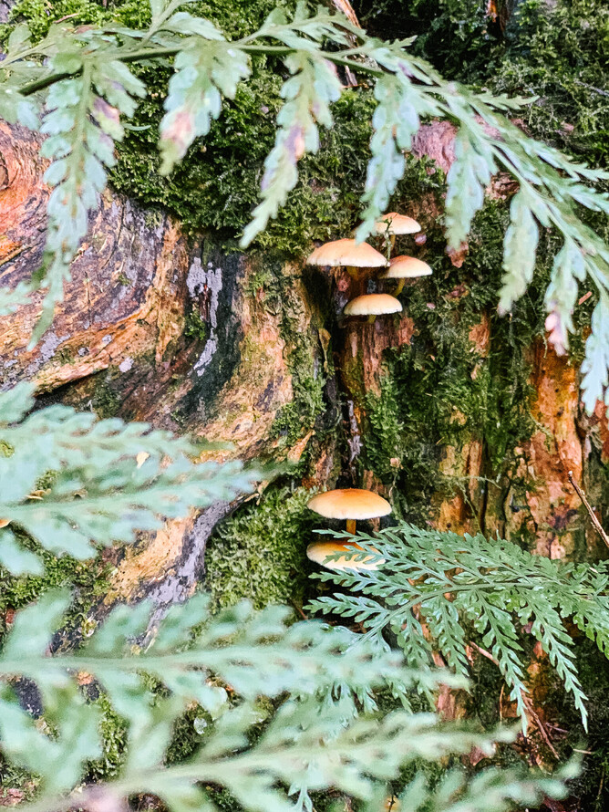 Moving further  along the Track towards the Bridge and alongside the quiet flowing stream, the temperature drops and the dark understory is full of ferns and mosses.  It is amazing to observe up close  moss carpets harbouring  tiny tiny fungi.  I came across a multitude of miniature pale fungi growing on a moss bed growing on an ancient Native Fuchsia (Kotukutuku) Tree.