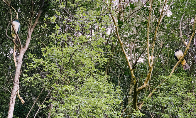 Listening intently to the silence for the sound of rustling of movement in the Bush broken by a Tui or Bellbird very close by. A sudden distinctive bird wing sound errupted and three magnificent Kereru birds swooped into a nearby tree and settled down on an overhead branch, completely oblivious to my presence. They weren’t feeding....just content to sit and contemplate quietly with their large white feather breasts all puffed up.