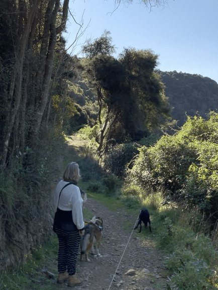 They were in such a state of excitement and not at all bothered by my presence or the dogs who by now were  strained the full length of leash whilst I dealt the to Vine wanting to move on.  So it was hilarious to see Piwakawakas alight on the “tightrope” dog leash using it as a convenient perch!