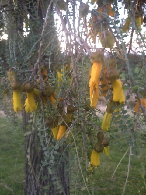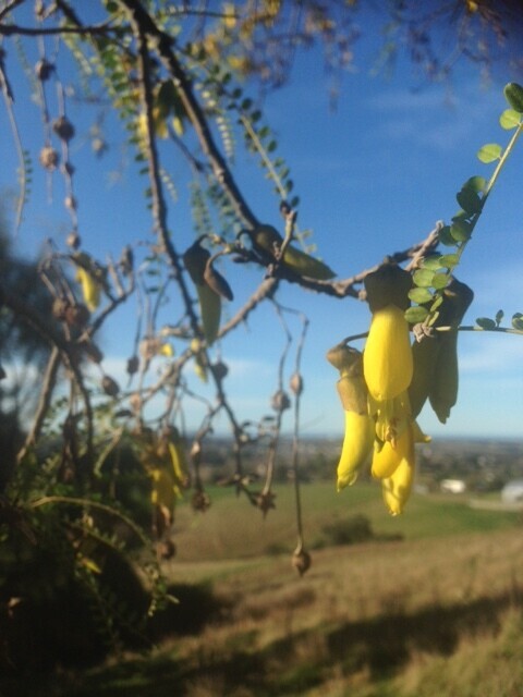 Kōwhai is a word used in te reo  for “yellow” and is used for a number of endemic species from the Sophora genus – all with strikingly bright, golden flowers.  Many Kōwhai are semi-deciduous, losing most of their leaves in the wintertime.  The eruption of sunny yellow flowers from the barren branches is considered a sign of the last frost of winter and a time to plant kumara.