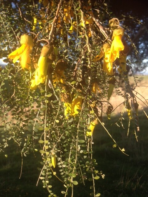 I was out walking this week and enjoying the brilliant winter sunshine when a noisy chorus of tūī and Korimako (bellbirds) closeby attracted my attention! Looking around to see where all the bird chatter was coming from I was amazed to see the excitement was coming from several Kōwhai trees that had a great many birds engaged in a frenzy of feeding off the bright yellow flowers hanging like bunches of golden bells. It seemed incredible to see Kōwhai trees flowering so early. A sign of early Spring and it’s not even MidWinter Solstice yet, and surely winter isn’t done! But here I was looking at a number of very ancient Kōwhai trees in full bloom!