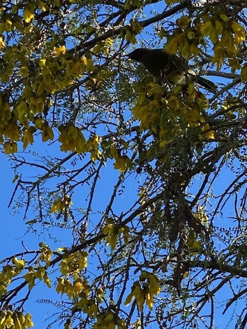 With the winter sunshine and the bursting Kowhai flowers, The Karimoku (Bellbird) have been very active and in full bird song to celebrate this stunning flowering.